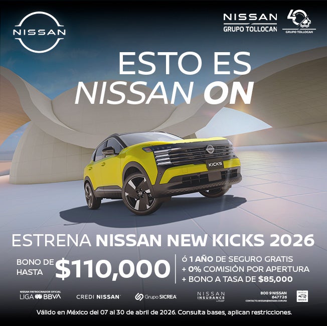 NISSAN KICKS 2026 Vigencia del 07 al 30 de abril de 2026 El plan aprobado dependerá de las condiciones financieras y comportamiento crediticio de cada cliente, ya sea que se apruebe por NR Finance México, S.A. de C.V. (“NRFM”). 1) La tasa de interés anual ordinaria fija del 5.99% (costo neto) aplica en operaciones de Crédito Nissan, con enganche desde 40% a un plazo de 60 meses para el modelo KICKS 2026 versión ADVANCE CVT ’26. 2) 1 año de seguro gratis aplica para el modelo KICKS 2026 en todas sus versiones, en operaciones de crédito. Únicamente con aseguradoras participantes y para uso particular. Consulta especificaciones con tu Distribuidor Autorizado Nissan®. Después de 1 año de seguro gratis, el cliente deberá contratar un seguro conforme a lo estipulado en su contrato de crédito. 3) El 0% de comisión por apertura, aplica para el modelo KICKS 2026 en todas sus versiones en Crédito Nissan en todos los plazos. 4) El precio desde $452,900.00 M.N. funge como precio especial a partir de un descuento (de $110,000.00 M.N. con IVA) sobre el precio de lista del vehículo para el modelo KICKS 2026 en la versión ADVANCE CVT ‘26 y aplica sólo en operaciones de crédito con el plan Crédito Nissan. La tasa de interés puede variar en funcion de las condiciones financieras contratadas. Oferta Crédito Nissan CAT PROMEDIO del 18.9% sin IVA para fines informativos y de comparacion calculado al 01/04/2026. El CAT puede variar si se contratan los créditos bajo distintas condiciones financieras.