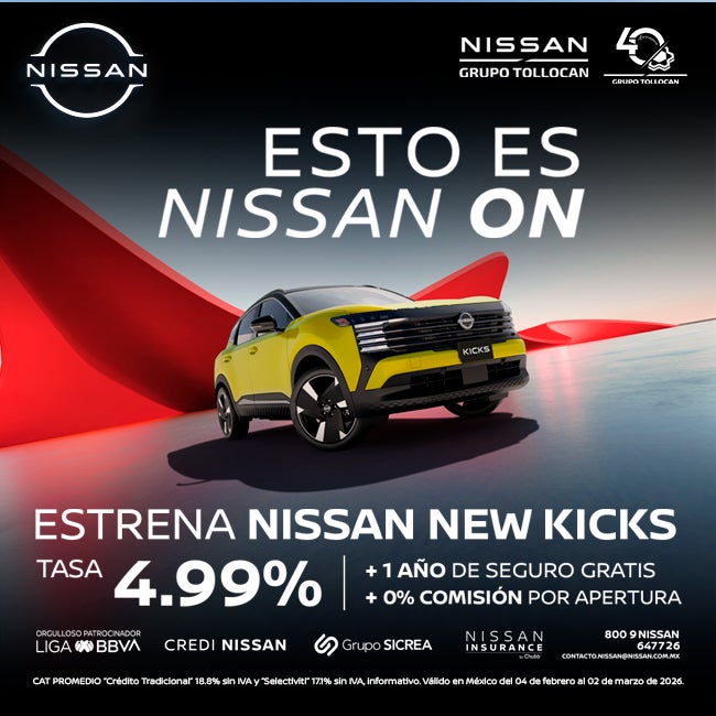 NISSAN KICKS 2025 Vigencia del 04 de febrero al 02 de marzo de 2026. El plan aprobado dependerá de las condiciones financieras y comportamiento crediticio de cada cliente, ya sea que se apruebe por NR Finance México, S.A. de C.V. (“NRFM”). 1) La tasa de interés anual ordinaria fija del 4.99% (costo neto) aplica en operaciones de Crédito Nissan, con enganche desde 37% a un plazo de 48 meses para el modelo KICKS 2025 en su versión KICKS SENSE CVT ‘25. 2) 1 año de seguro gratis aplica para el modelo KICKS 2025 en todas sus versiones, en operaciones de crédito. Únicamente con aseguradoras participantes y para uso particular. Consulta especificaciones con tu Distribuidor Autorizado Nissan®. Después de 1 año de seguro gratis, el cliente deberá contratar un seguro conforme a lo estipulado en su contrato de crédito. 3) El 0% de comisión por apertura aplica para el modelo KICKS 2025 en todas sus versiones en Crédito Nissan en todos los plazos. 4) La oferta de empieza a pagar en MAYO 2026 es válida para el modelo KICKS en todas sus versiones, en operaciones de crédito tradicional y Selectiviti, en todos los plazos y con un enganche desde el 20%. La tasa de interés puede variar en funcion de las condiciones financieras contratadas. Oferta Crédito Nissan CAT PROMEDIO del 18.8% sin IVA para fines informativos y de comparacion calculado al 01/02/2026. El CAT puede variar si se contratan los créditos bajo distintas condiciones financieras.