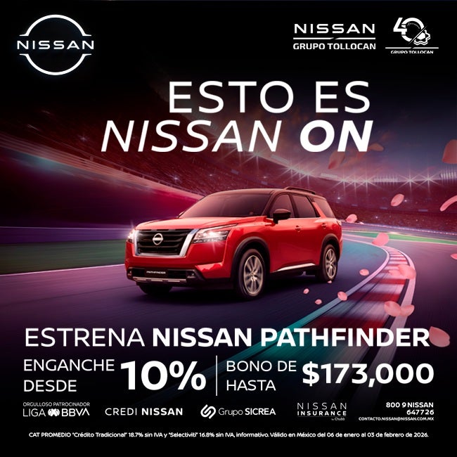 NISSAN PATHFINDER 2025 Vigencia del 06 de enero al 03 de febrero de 2026. El plan aprobado dependerá de las condiciones financieras y comportamiento crediticio de cada cliente, ya sea que se apruebe por NR Finance México, S.A. de C.V. (“NRFM”). 1) El enganche desde el 10% aplica en el plan “Crédito Nissan” para todas las versiones de PATHFINDER 2025, en un plazo de 24 hasta 72 meses. 2) El bono de $173,000.00 M.N.. (con IVA) aplica exclusivamente sobre el precio de lista en operaciones de crédito para el modelo PATHFINDER 2025 en todas sus versiones con el plan Crédito Nissan. 3) 1 año de seguro gratis aplica para el modelo PATHFINDER 2025 en todas sus versiones en operaciones de crédito. Únicamente con aseguradoras participantes y para uso particular. Consulta especificaciones con tu Distribuidor Autorizado Nissan®. Después de 1 año de seguro gratis, el cliente deberá contratar un seguro conforme a lo estipulado en su contrato de crédito. 4) El 0% de comision por apertura aplica para el modelo PATHFINDER 2025 en todas sus versiones con el plan Crédito Nissan. 5) La oferta de empieza a pagar en ABRIL 2026 es válida para el modelo PATHFINDER en todas sus versiones, en operaciones de crédito tradicional y Selectiviti, en todos los plazos y con un enganche desde el 20%. La tasa de interés puede variar en funcion de las condiciones financieras contratadas. Oferta "Crédito Nissan " CAT PROMEDIO del 18.7% sin IVA para fines informativos y de comparacion calculado al 01/01/2026. El CAT puede variar si se contratan los créditos bajo distintas condiciones financieras. Oferta "Selectiviti" CAT PROMEDIO del 16.8% sin IVA para fines informativos y de comparacion calculado al 01/01/2026. El CAT puede variar si se contratan los créditos bajo distintas condiciones financieras.