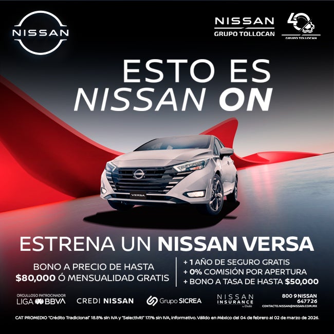 NISSAN VERSA 2025 Vigencia del 04 de febrero al 02 de marzo de 2026. El plan aprobado dependerá de las condiciones financieras y comportamiento crediticio de cada cliente, ya sea que se apruebe por NR Finance México, S.A. de C.V. (“NRFM”). 1) La mensualidad de $4,999.00 M.N. (con IVA) aplica exclusivamente en operaciones de crédito con el Plan Crédito Nissan para el modelo VERSA 2025 en su versión SENSE TM ’25 a un plazo de 60 meses y un 37.5% de enganche. Pagando el seguro de contado, sin accesorio adicionales. 2) La oferta de empieza a pagar en MAYO 2026 es válida para el modelo VERSA en todas sus versiones, en operaciones de crédito tradicional y Selectiviti, en todos los plazos y con un enganche desde el 20%. 3) La oferta de mensualidad gratis aplica para el modelo VERSA 2025 en todas sus versiones y corresponderá a la segunda mensualidad establecida en el contrato que se celebre con NRFM. La primera mensualidad y a partir de la tercera, el cliente deberá pagar conforme a lo establecido en su contrato, para acceder a esta oferta se requieren las siguientes condiciones financieras: acceder a un Plan Crédito Nissan con un enganche mínimo del 25% en un plazo desde 36 a 72 meses. 4) 1 año de seguro gratis aplica para el modelo VERSA 2025 en todas sus versiones, en operaciones Crédito Nissan, Plan Selectiviti y Leasing. Únicamente con aseguradoras participantes y para uso particular. Consulta especificaciones con tu Distribuidor Autorizado Nissan®. Después de 1 año de seguro gratis, el cliente deberá contratar un seguro conforme a lo estipulado en su contrato de crédito. 5) El 0% de comisión por apertura aplica para el modelo VERSA 2025 en todas sus versiones con el Crédito Nissan, Plan Selectiviti y Leasing. La tasa de interés puede variar en funcion de las condiciones financieras contratadas. Oferta "Crédito Nissan " CAT PROMEDIO del 18.8% sin IVA para fines informativos y de comparacion calculado al 01/02/2026. El CAT puede variar si se contratan los créditos bajo distintas condiciones financieras. Oferta "Selectiviti" CAT PROMEDIO del 17.1% sin IVA para fines informativos y de comparacion calculado al 01/02/2026. El CAT puede variar si se contratan los créditos bajo distintas condiciones financieras.